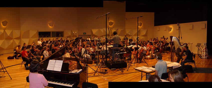 For the largest session I think the orchestra was around 57 players plus a choir of 16 and around 32 for the smallest. There was also one 3 hour call with just choir. Otherwise we recorded the choir with the orchestra because I was after that more integrated sound. We recorded at the new Trackdown Scoring Stage on the Fox lot in Sydney which has a beautiful warm choral tone.